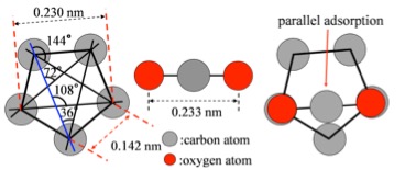 下図:吸着サイトのモデル図:CO2分子内のO原子は五員環の対角線上にある炭素原子の直上に位置していると考えられる。![]()